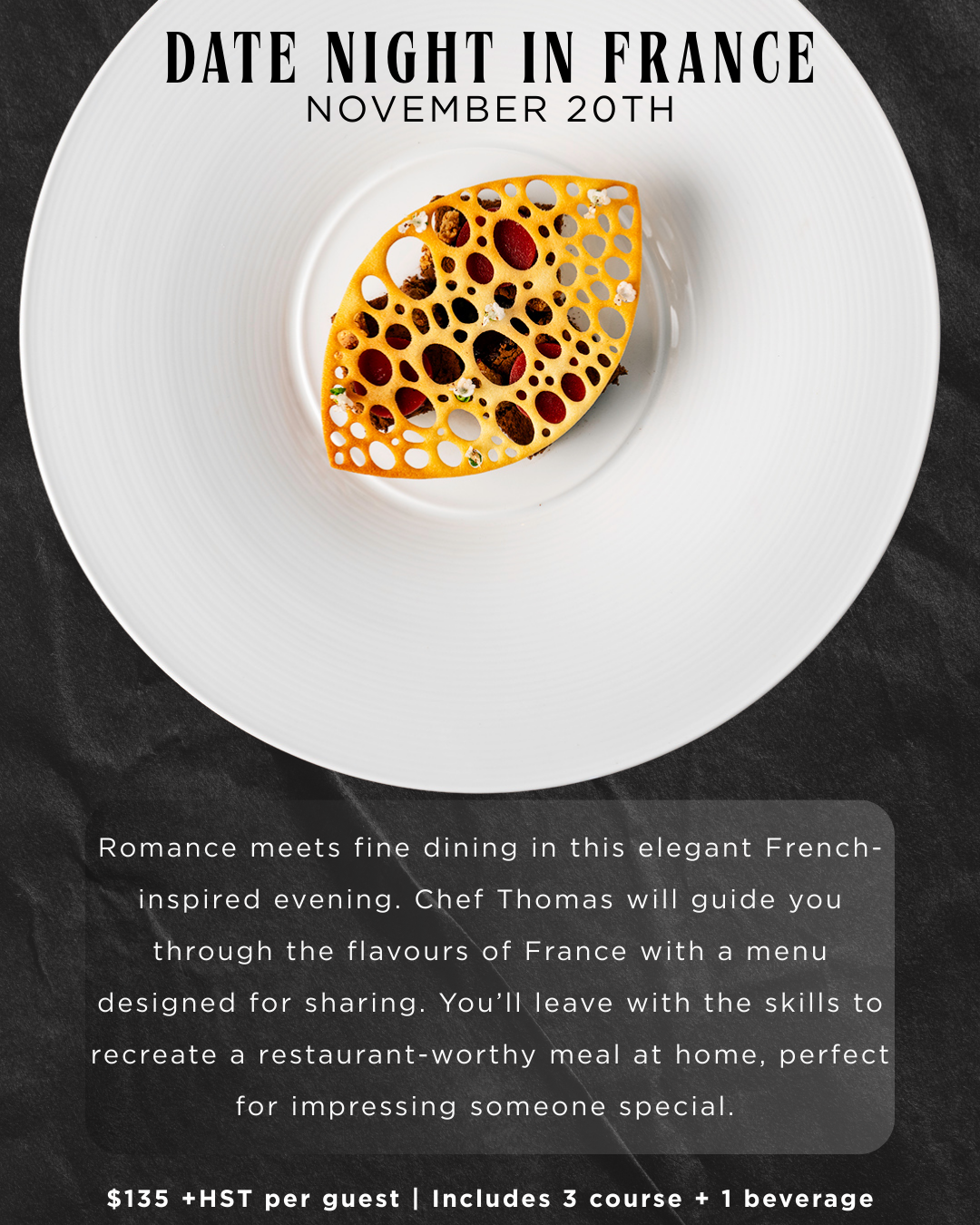 Romance meets fine dining in this elegant French-inspired evening. Chef Thomas will guide you through the flavours of France with a menu designed for sharing. You'll leave with the skills to recreate a restaurant-worthy meal at home, perfect for impressing someone special. $135 +HST per guest | Includes 3 course + 1 beverage Thursday, November 20, 2025 | 6:00 PM | 26779 Talbot Line, Wallacetown, ON