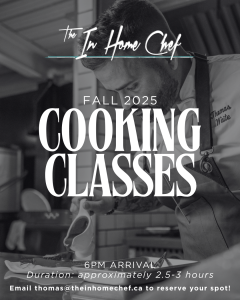 Our cooking classes in London, Ontario are the perfect opportunity to connect with food in new and meaningful ways while learning tips and tricks that you can bring into your daily life. Whether you are a new or experienced, our one-of-a-kind cooking classes will introduce you to a different way of cooking and the ‘In Home Chef approach’ to the fine dining experience.